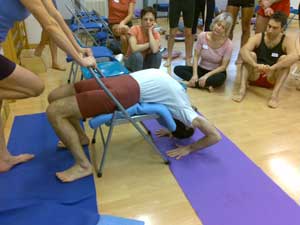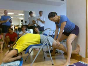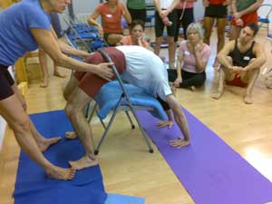 Ed è stato molto proficuo: oltre a praticare le posizioni, abbiamo appreso come insegnarle, come aiutare coi supporti e come correggere manualmente. Duro lavoro sulle nostre schiene! Guardare per credere.